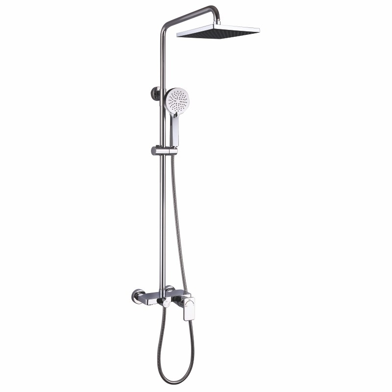 主体附带水龙头黄铜主体,主体宽度含开关147mm,附带控制出水部件开关安装两孔中心150±2mm,主体总长220mm2-G1/2外丝连接进水,不锈钢软管1.5M手持塑料喷头不锈钢直管25/22mm,高度可调节850-1200mm延伸方形顶喷长度370mm顶喷花洒直径225mm,圆形手持花洒高度可调