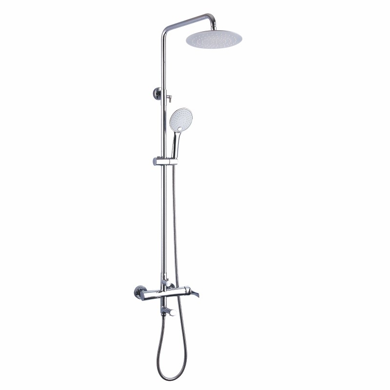 合金长把手,带水龙头黄铜主体,安装两孔中心150±2mm, 主体总长276mm2-G1/2外丝连接进水,不锈钢软管1.5M,手持塑料喷头不锈钢直管25/22mm,高度可调节850-1200mm,延伸圆形顶喷长度380mm顶喷花洒直径200mm,圆形手持花洒高度可调