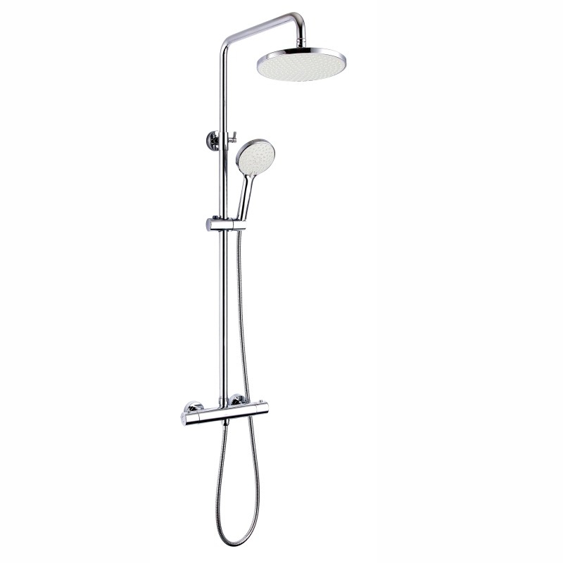 合金圆把手,不带水龙头黄铜主体,安装两孔中心150±2mm主体总长276mm2-G1/2外丝连接进水,不锈钢软管1.5M,手持塑料喷头不锈钢直管25/22mm, 高度可调节850-1200mm,延伸圆形顶喷长度380mm顶喷花洒直径220mm,圆形手持花洒高度可调